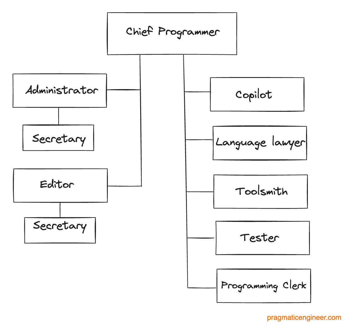 The concept of “hierarchical programming” feels dated. One thing that strikes me about Brooks’s model is that it’s hierarchical. The “chief programmer” acts as an architect and does all planning, most direction setting, and some coding, while everyone else works well-defined, supporting roles. The copilot is described as: