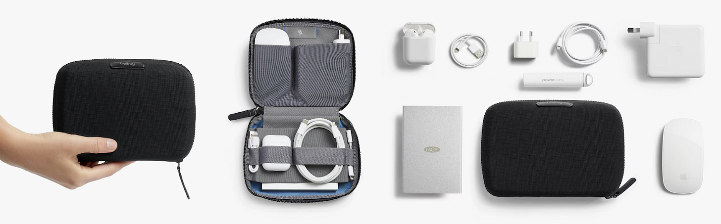 Bellroy Tech Kit – a pouch for keeping cables, an adapter, and a mouse, in one place when traveling.
