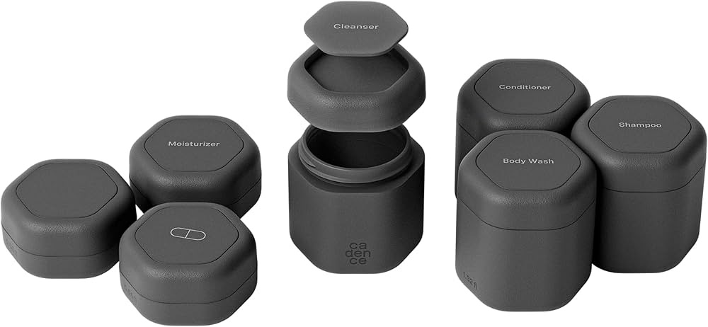 Cadence magnetic travel containers. Leakproof travel-size jars for storing liquids like shampoo, body wash, and vitamins, or even jewelry. Both the jar and the lid are magnetic, making them easy to keep track of. Very useful when travelling, and also handy at home.