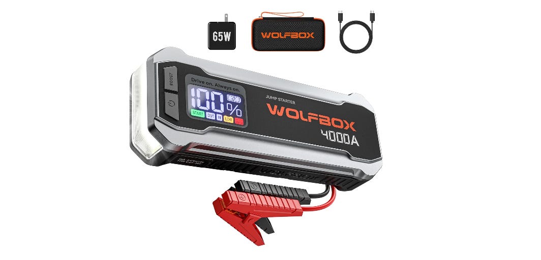 Car jump starter + power bank + flashlight. I got one of these when my car’s battery died, and it’s been around ever since. It’s my go-to power bank when I need to plug something in, and serves as a reserve flashlight.