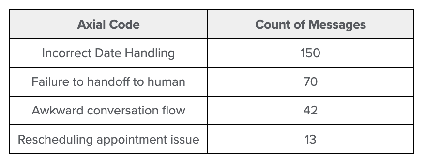 After annotating dozens of conversations, NurtureBoss had amassed a rich, messy collection of notes. To find the signal amid the noise, they grouped these notes into themes in a step called axial coding. An LLM helped with the initial grouping of open codes into categories (aka the axial codes), which the team then reviewed and refined. A simple pivot table revealed that just three issues accounted for most problems: date handling, handoff failures, and conversation flow issues. This provided a clear, data-driven priority of failure modes in the application. Below is an illustration of what a partial view of this pivot table might look like, which is a count of failure categories:
