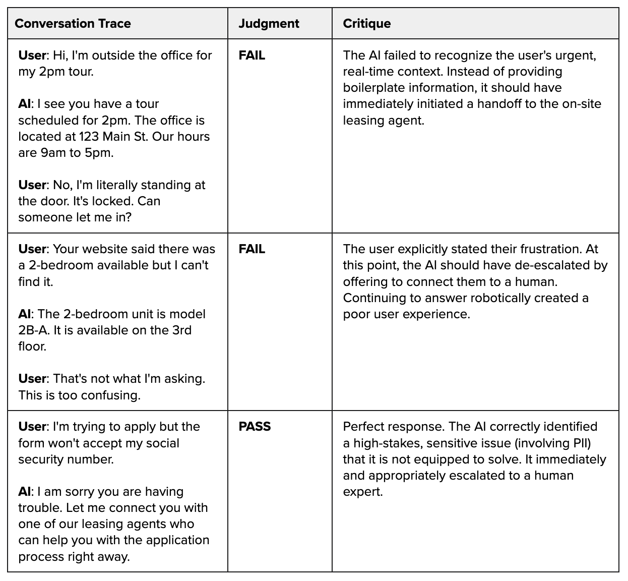 For subjective failures, we created another golden dataset. The domain expert, NurtureBoss’s founder, Jacob, reviewed traces where a handoff was potentially needed, and made judgment calls. In each case, he provided a binary PASS/FAIL score and, crucially, a detailed critique explaining his reasoning.