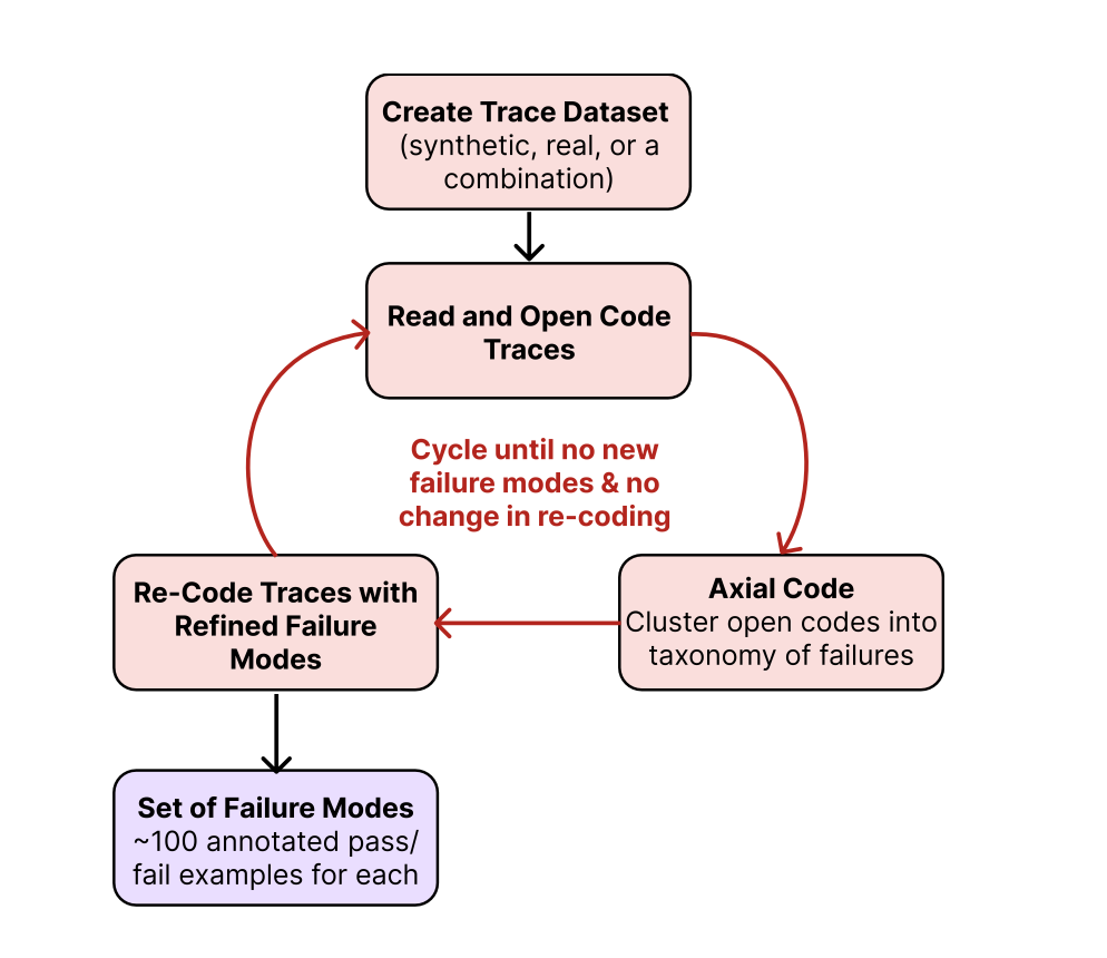 This process of discovering failures from data isn’t a new trick invented for LLMs; it’s a battle-tested discipline known as error analysis, which has been a cornerstone of machine learning for decades, and is adapted from rigorous qualitative research methods like grounded theory in the social sciences. Next, let’s summarize this process into a step-by-step guide to apply to your problem.