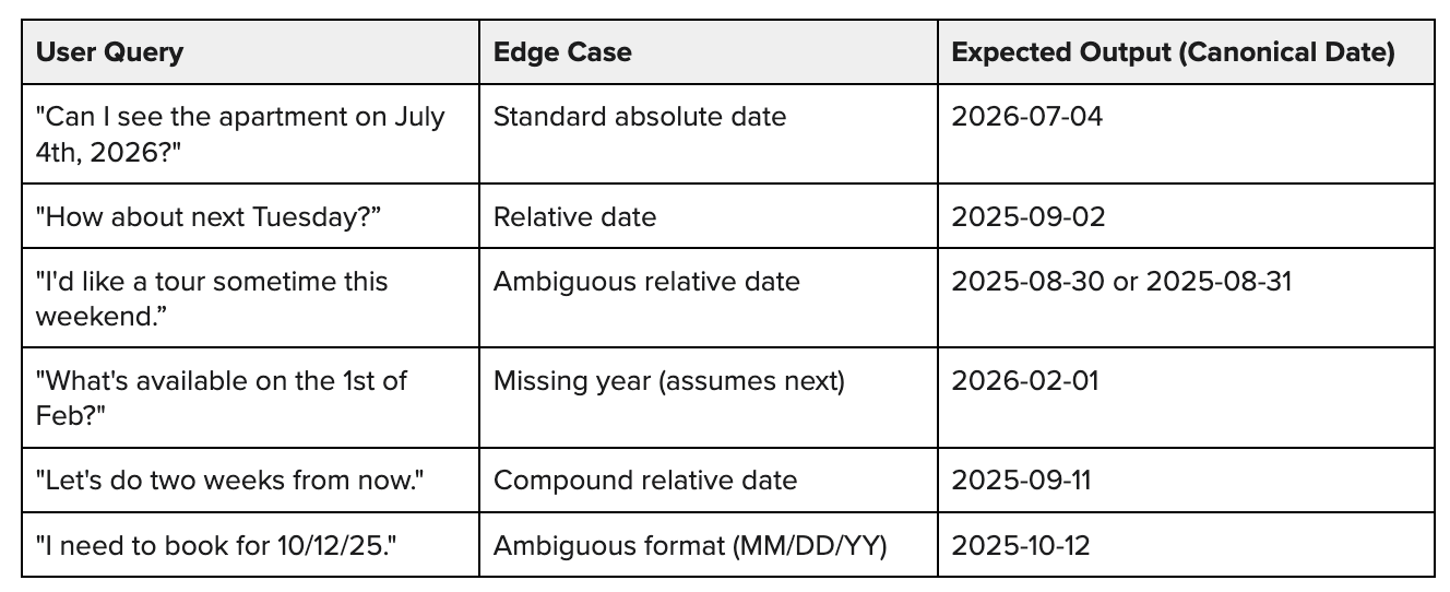 A user query like “can I see the apartment on July 4th, 2026?” has one – and only one – correct interpretation. The AI’s job is to extract that date and put it into the right format for a downstream tool. This is a deterministic, objective task that’s either right or wrong.