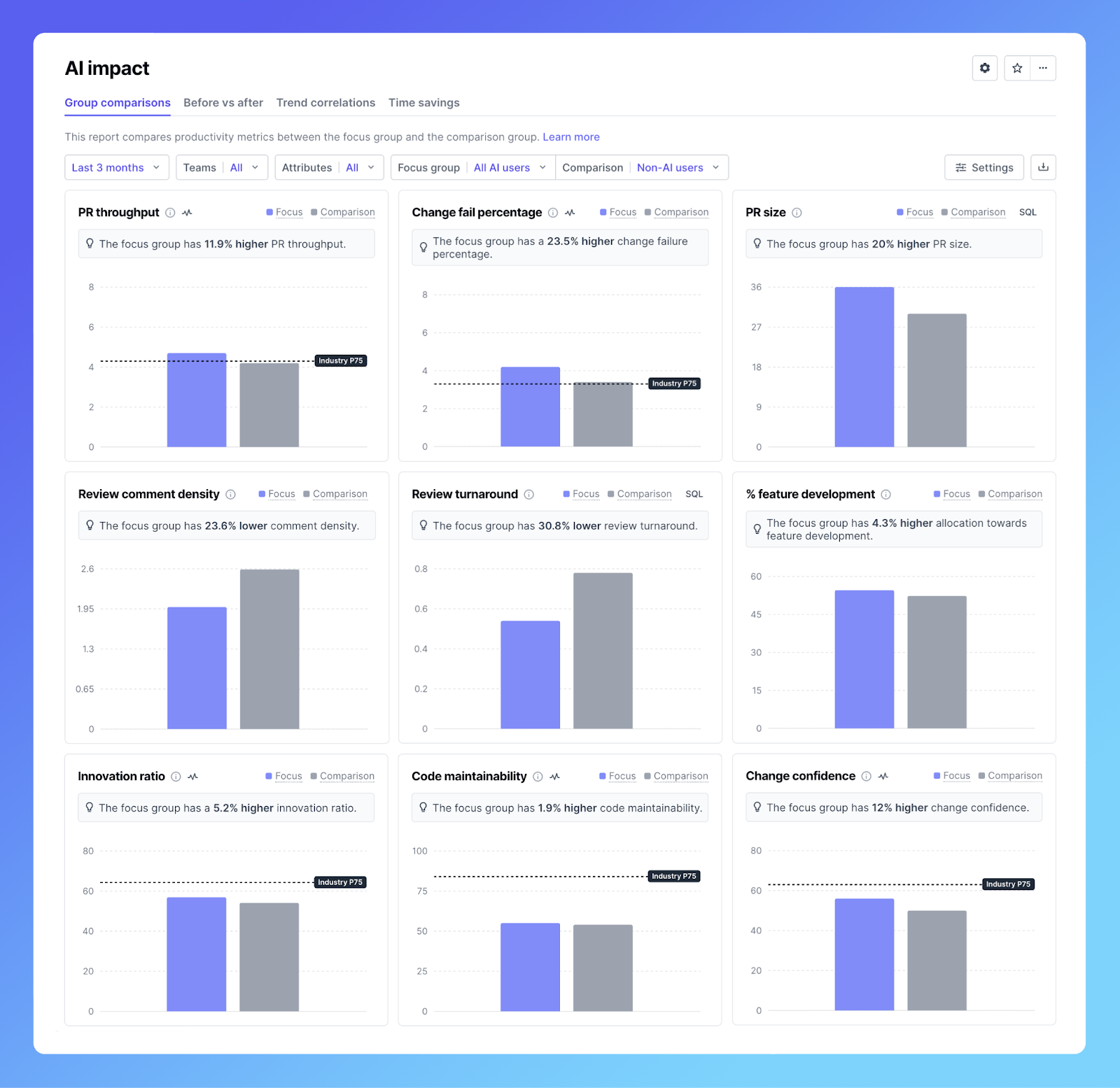 Taking these measurements once won’t give you much insight into AI impact; tracking them over time is what reveals trends and patterns.