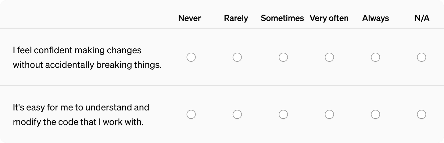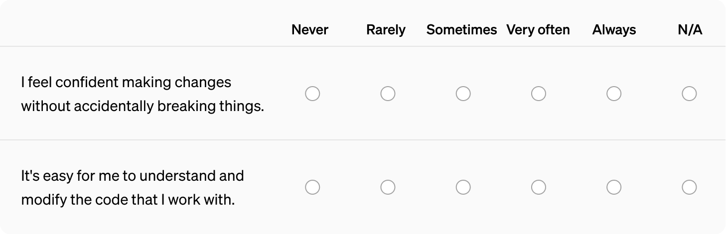 In order to correlate AI usage with changes in quality and maintainability over time you’ll want more structured data, and for this, a periodic developer experience survey is a good approach.