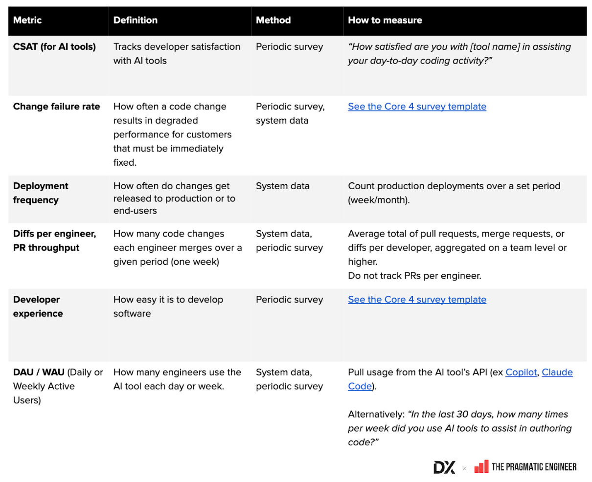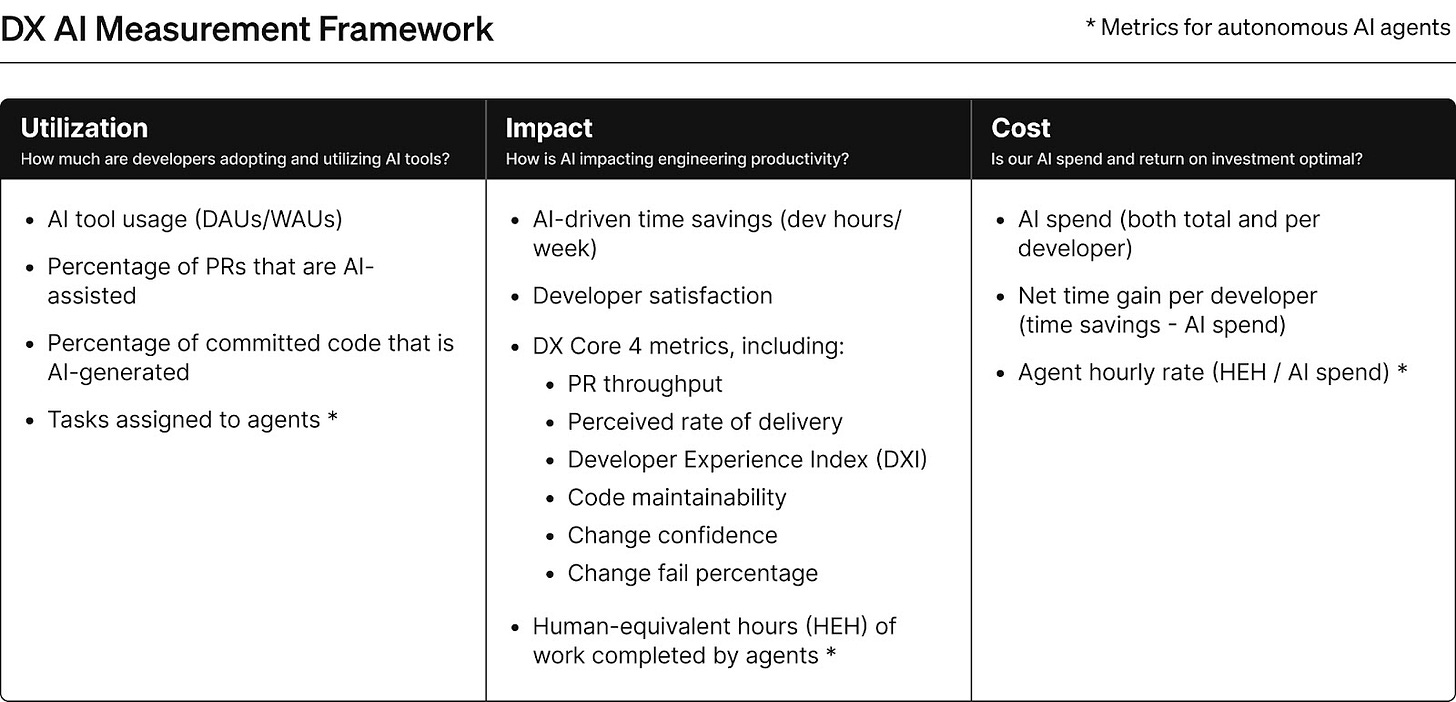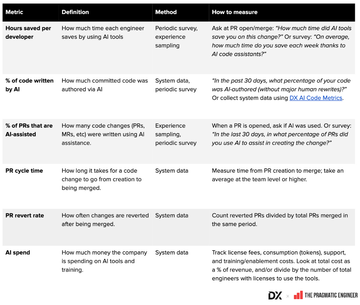 Earlier this year, I co-authored the AI Measurement Framework, which is a recommended set of metrics to track AI adoption and impact across engineering teams. This framework is built upon rigorous field research, as well as data analysis from 400+ companies, and how they’re actually rolling out and measuring AI tools.
