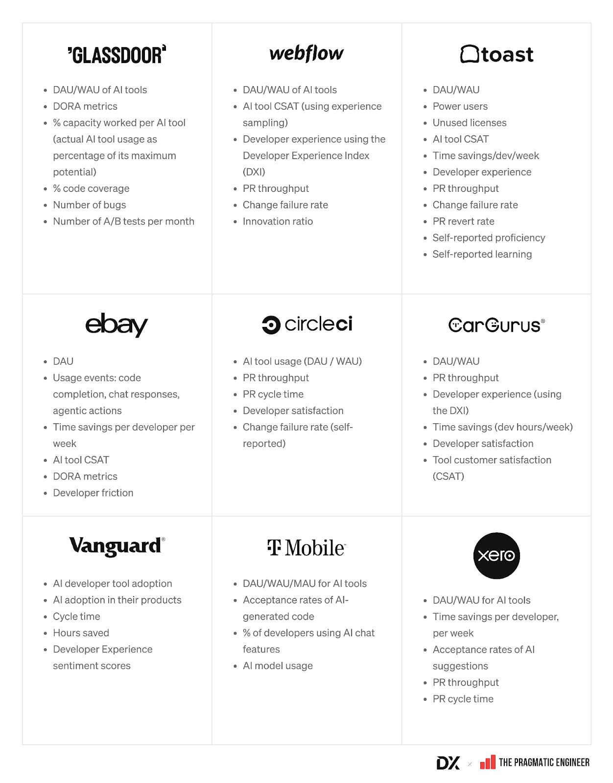 Unique metrics, interesting trends. Microsoft measures “bad developer days,” while Glassdoor measures experimentation outcomes from AI tools. It’s likely that more teams will measure data on how autonomous AI agents perform.