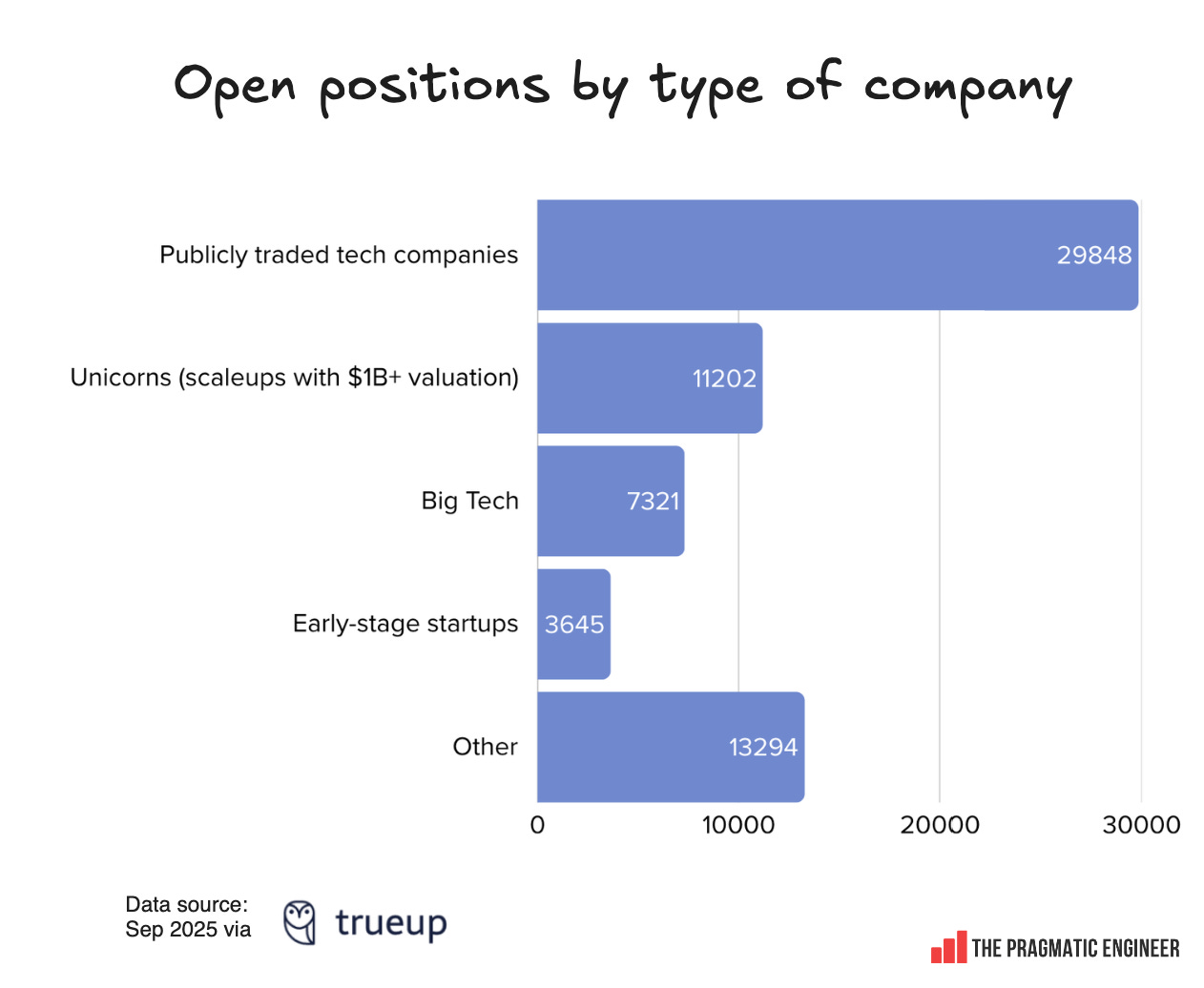 TrueUp: a platform that scans every open job at Big Tech, top startups, and scaleups which typically pay in the top two tiers of the trimodal software engineering compensation model. You can browse all open engineering roles here, and sign up for alerts when new jobs are posted. Thanks to Amit Taylor for data points.
