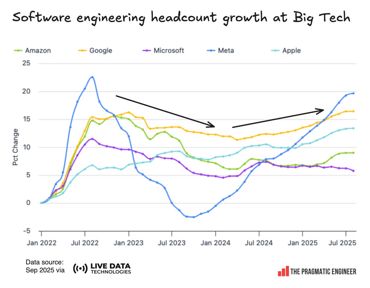 Big Tech hiring stats. Following layoffs in 2022-23, engineering headcount is rising in Big Tech.