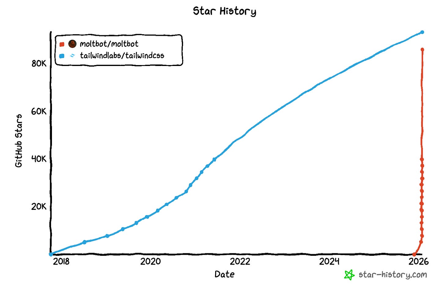 Last week, usage of Peter’s hobby project, Clawd — as of yesterday, Molt — has skyrocketed. It is the fastest-ever growing repository on GitHub, by the number of stars. Here’s how it compares to the also very popular Tailwind CSS in this dimension: