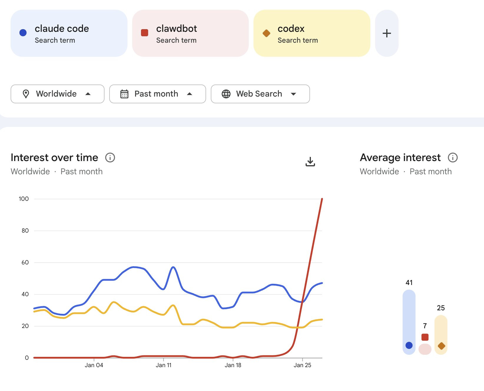 Clawdbot has also been more searched on Google than Claude Code or Codex — which is truly remarkable: