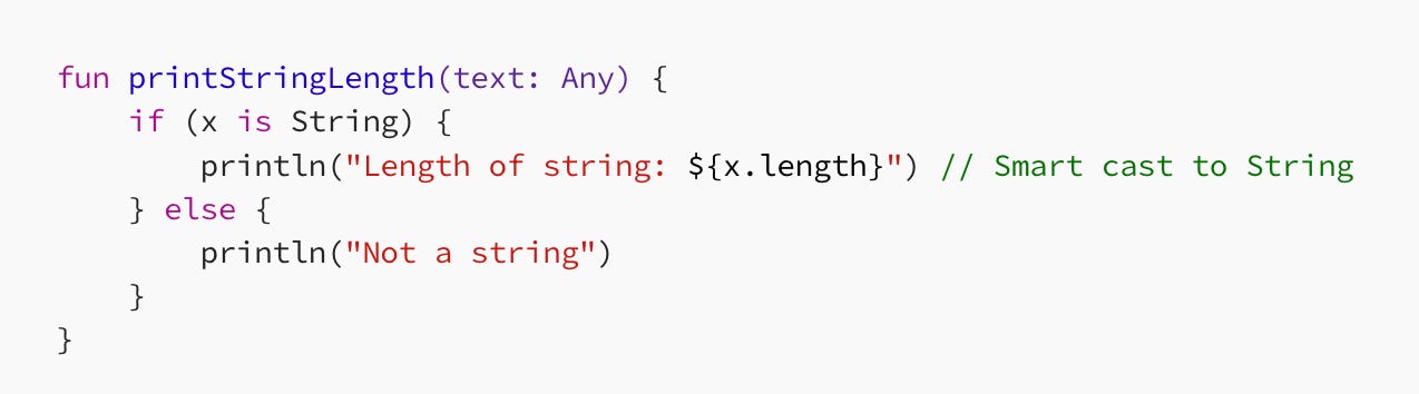 5. Smart casts were inspired by an obscure language called Gosu. Smart casts is a pleasant language feature in Kotlin, which is rare to see in other typesafe languages: after an if (x is String) check, Kotlin automatically treats x as String inside the branch — eliminating the redundant cast that litters Java code.