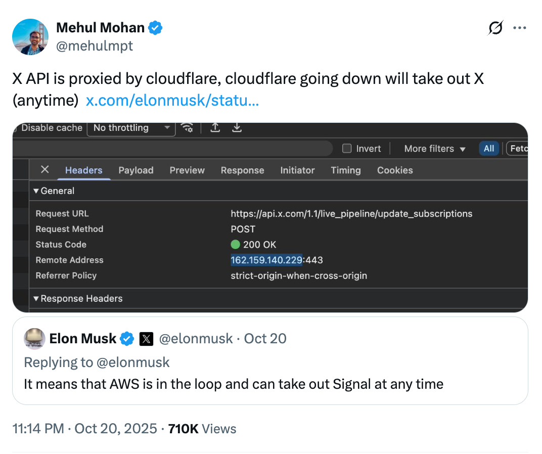 Separately, you may or may not recall that during a different recent outage caused by AWS, Elon Musk noted on his website, X, that AWS is a hard dependency for Signal, meaning an AWS outage could take down the secure messaging service at any moment. In response, a dev pointed out that it is the same for X with Cloudflare – and so it proved earlier this week, when X was broken by the Cloudflare outage.