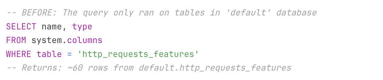 A database permissions change in ClickHouse kicked things off. Before the permissions changed, all queries to fetch feature metadata (to be used by the Bot Management module) would have only been run on distributed tables in Clickhouse, in a database called “default” which contains 60 features.