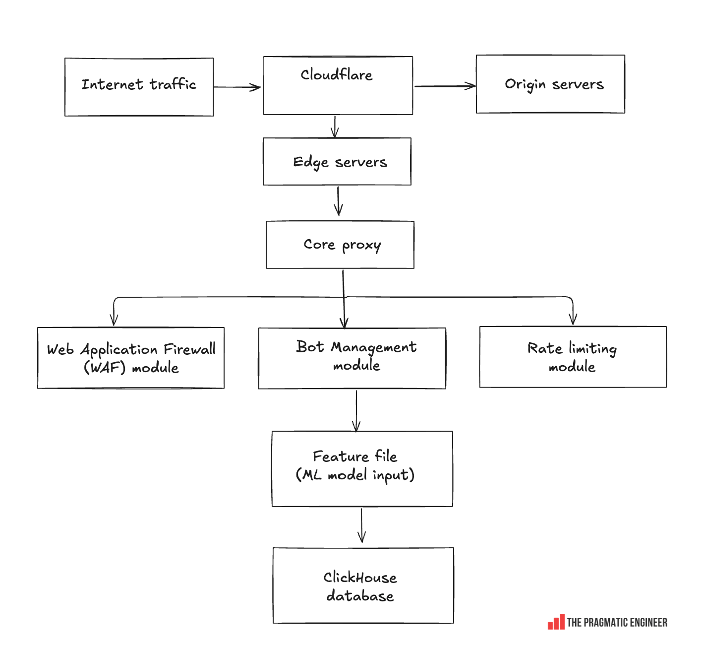 Within hours of mitigating the outage, Cloudflare’s CEO Matthew Prince shared an unusually detailed report of what exactly went wrong. The root cause was to do with propagating a configuration file to Cloudflare’s Bot Management module. The file crashed Bot Management, which took Cloudflare’s proxy functionality offline.