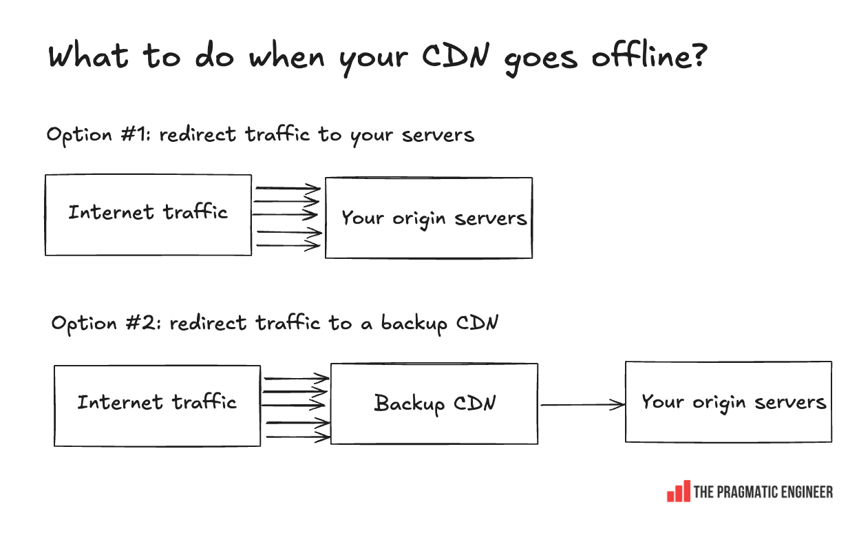 When using a CDN, you propagate addresses that point to that CDN server’s IP or domain. When the CDN goes down, you could start to redirect traffic to your own origin servers (and deal with the traffic spike), or utilize a backup CDN, if you prepared for this eventuality.