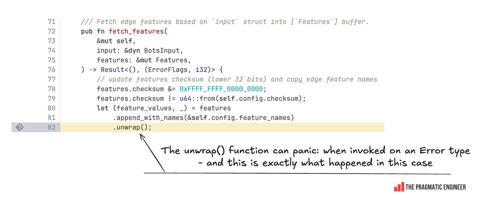 A system panic hit machines served with the incorrect feature file. Cloudflare was nice enough to share the exact code that caused this panic, which was this unwrap() function: