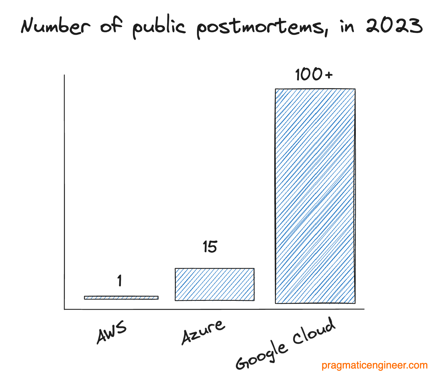 However, as a market leader, every vendor wants to take your customers from you. This means each AWS outage is another sales opportunity for the other cloud providers to make the case on why they are more reliable. Could it be that AWS is worried about losing market share if it would exercise more transparency by publicly sharing outages? I don’t know, but it’s my best guess as to why Azure publishes 15x as many postmortems as AWS does, and why Google Cloud produces 100x more than AWS every year.