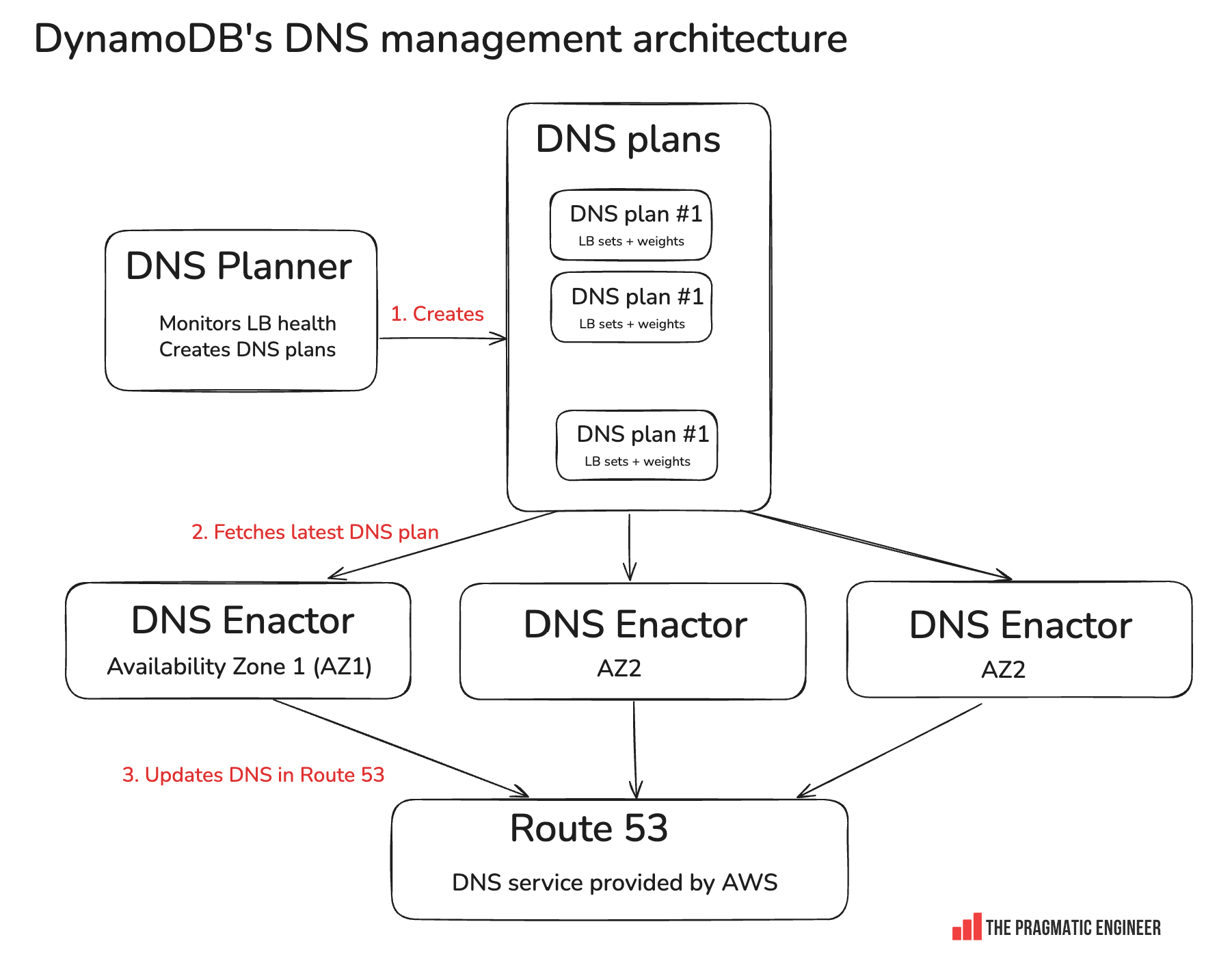 DNS enactor: the service responsible for updating the routes in Amazon’s DNS service called Route 53. For resiliency, there is one DNS enactor running in each availability zone (AZ). In us-east-1, there are 3 AZs, and 3x DNS Enactor instances.