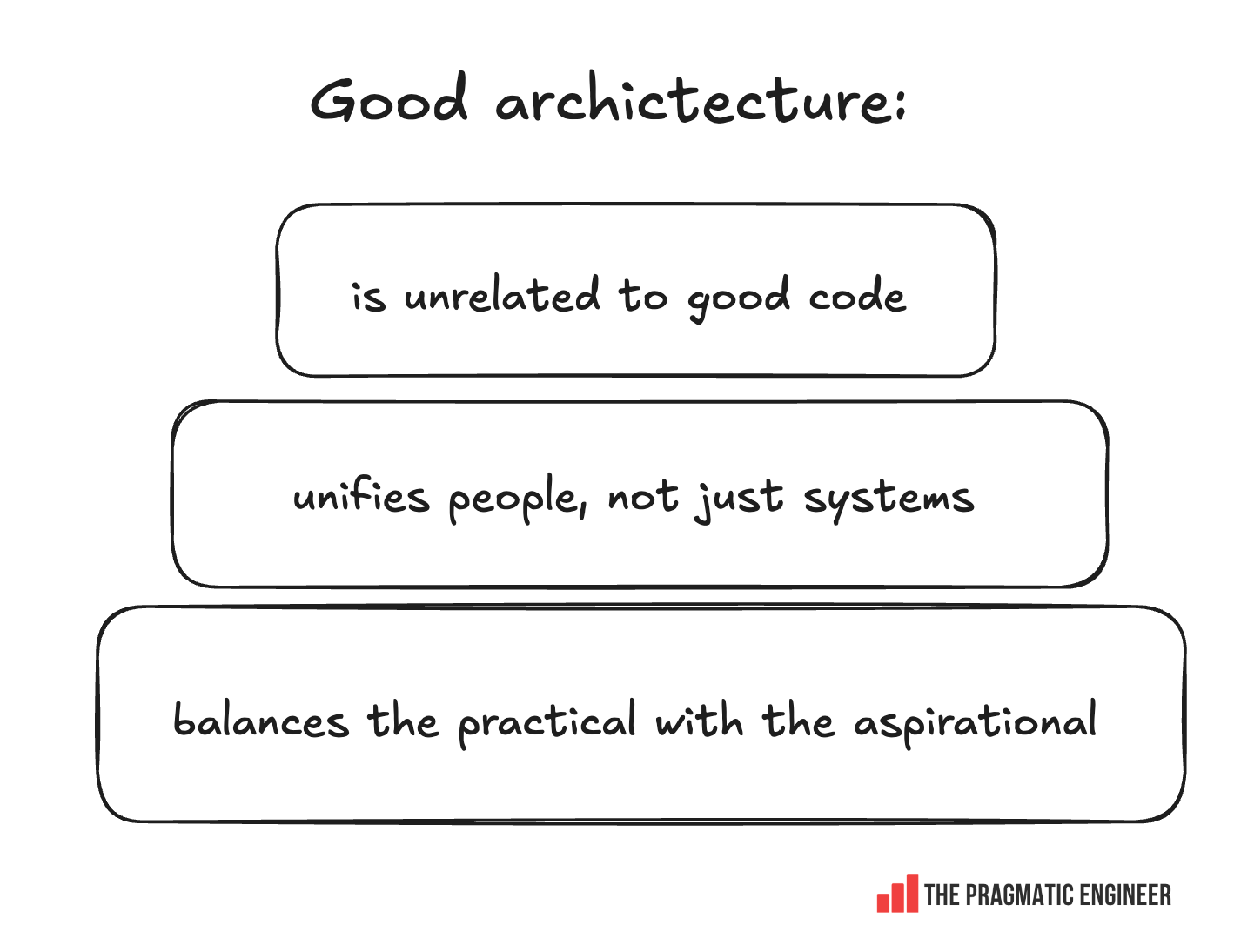 Good characteristics of architecture. These balance practical and aspirational concerns, unify people as well as systems – and are unrelated to good code.